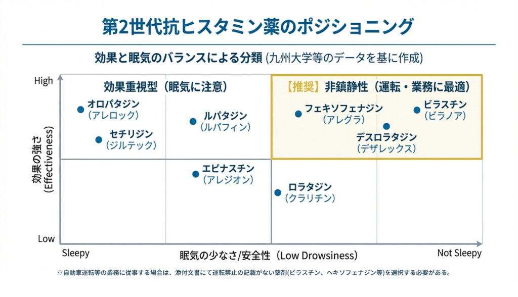 眠気の出にくく、高い安全性が証明されています。効果は比較的穏やかですが、集中力の低下(インペアード・パフォーマンス)が起こりにくく、仕事や勉強への影響を最小限に抑えたい方に最適です。